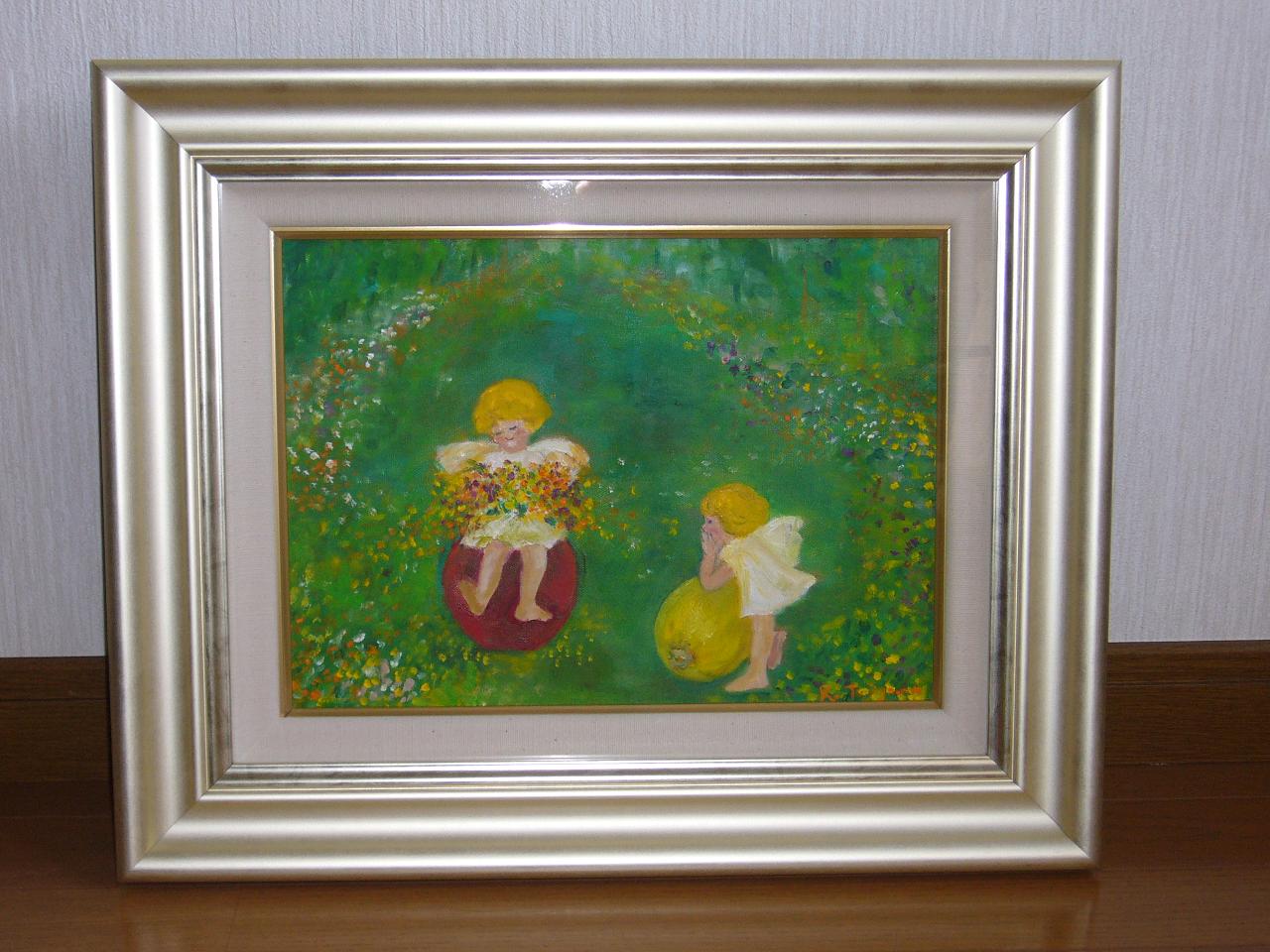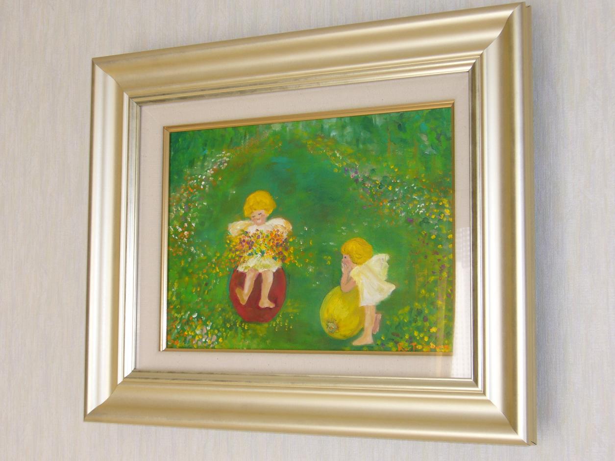 羽のくっついたかわい~い天使、ふかいみどりの森、色とりどりのちっちなお花。